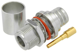 Our female 7/16 DIN bulkhead to female N bulkhead cable assembly uses a flexible cable type that is 50 Ohm. Pasternack PE3W09783 7/16 DIN female bulkhead to N female bulkhead cable assembly is constructed with LMR-600 coax.