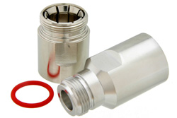 Our male N right angle to female N cable assembly uses a corrugated cable type that is 50 Ohm. Pasternack PE3W01287 N male right angle to N female cable assembly is constructed with 1/2" Flexible coax.