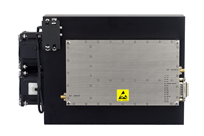 Additional key performance features of this high power RF amplifier include 45 dB minimum small signal gain, +/- 1.5 dB typical gain flatness @ Psat and an impressive harmonic suppression level of -20 dBc typical. To ensure highly reliable thermal management, this RF GaN amplifier module incorporates a heatsink and cooling fan that maintains an optimum baseplate temperature of 0°C to +50°C, with automatic shutdown capability at 85°C. PE15A5033F 100 watt GaN amplifier package assembly supports SMA-female RF connectors at the input and output ports and a D-Sub connector with control functions that include +30 Vdc bias, current monitoring and TTL logic blanking. Another primary advantage of this high gain GaN amplifier is its rugged design platform capable of withstanding harsh environmental conditions including humidity, altitude, shock and vibration