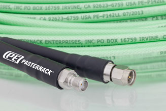 Pasternack Enterprises’ new low loss test cables utilize a 0.195 inch diameter coax with an expanded dielectric which results in 83% Velocity of Propagation (VoP) performance up to 18 GHz. These coaxial cable assemblies from Pasternack are made with PE-P142LL coax, which operates at higher power with improved phase stability. The double shielded flexible coax provides excellent shielding effectiveness greater than 95 dB and VSWR of less than 1.35:1. A heavy duty boot and FEP jacket improve strain relief and allow for a minimum bend radius of 1 inch which adds to the durability of these cable assemblies.