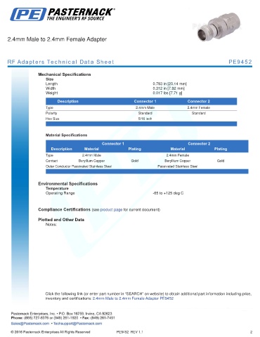 inventory and certifications: 2.4mm Male to 2.4mm Female Adapter PE9452