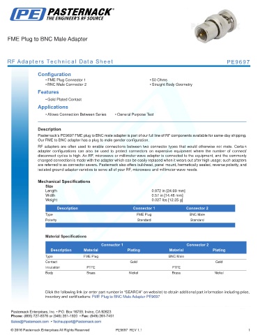 inventory and certifications: FME Plug to BNC Male Adapter PE9697