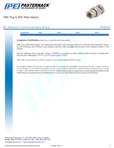 inventory and certifications: FME Plug to BNC Male Adapter PE9697