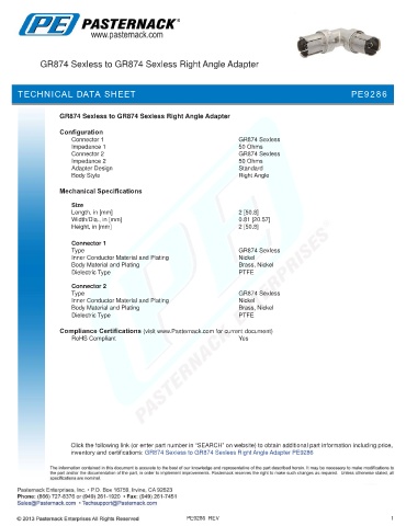 inventory and certifications: GR874 Sexless to GR874 Sexless Right Angle Adapter PE9286