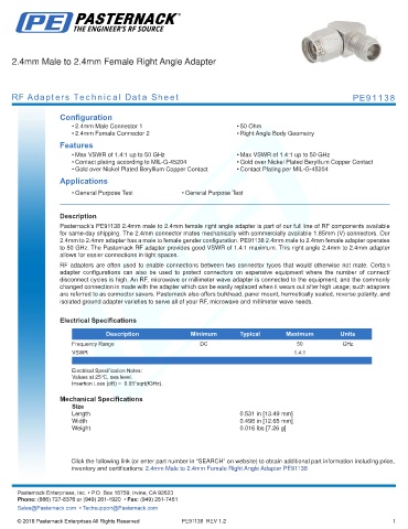 to 50 GHz. The Pasternack RF adapter provides good VSWR of 1.4:1 maximum. This right angle 2.4mm to 2.4mm adapter