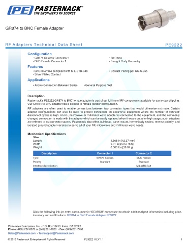 inventory and certifications: GR874 to BNC Female Adapter PE9222