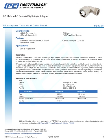 Pasternack’s PE9398 LC male to LC female right angle adapter is part of our full line of RF components available for same-