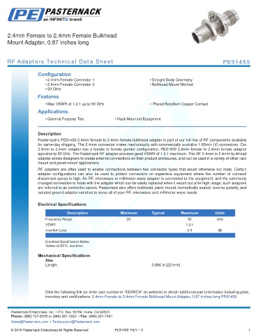 operates to 50 GHz. The Pasternack RF adapter provides good VSWR of 1.3:1 maximum. This RF 2.4mm to 2.4mm bulkhead