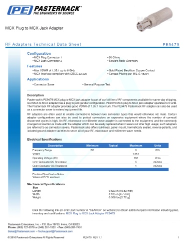 inventory and certifications: MCX Plug to MCX Jack Adapter PE9479