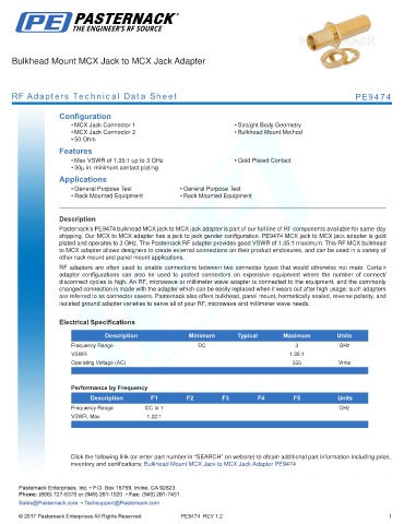 plated and operates to 3 GHz. The Pasternack RF adapter provides good VSWR of 1.35:1 maximum. This RF MCX bulkhead