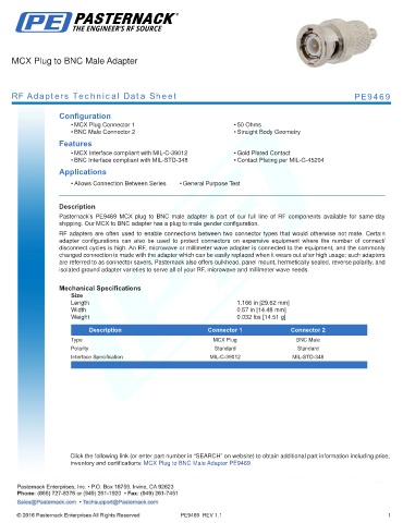 inventory and certifications: MCX Plug to BNC Male Adapter PE9469