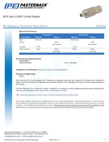 inventory and certifications: MCX Jack to BNC Female Adapter PE9466