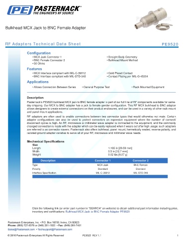 inventory and certifications: Bulkhead MCX Jack to BNC Female Adapter PE9520