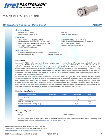 inventory and certifications: MHV Male to BNC Female Adapter PE9297