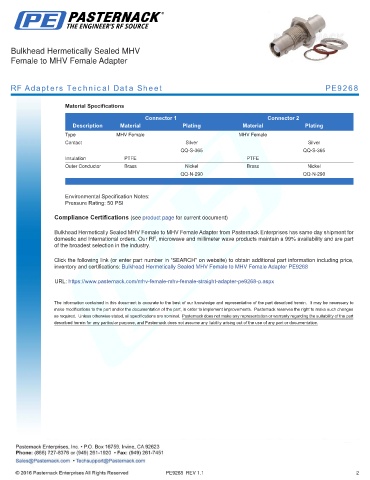 inventory and certifications: Bulkhead Hermetically Sealed MHV Female to MHV Female Adapter PE9268