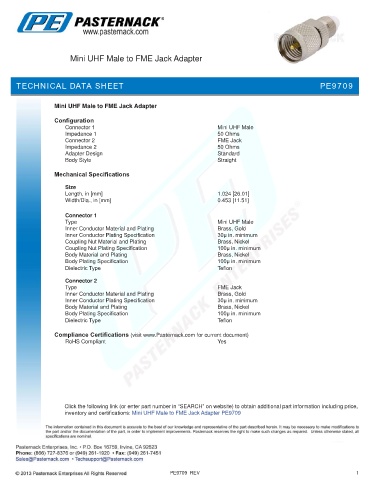 inventory and certifications: Mini UHF Male to FME Jack Adapter PE9709
