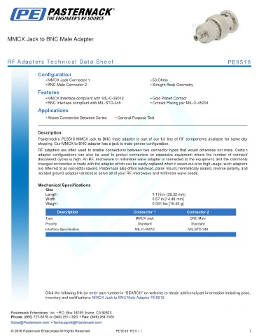 inventory and certifications: MMCX Jack to BNC Male Adapter PE9518