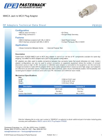 inventory and certifications: MMCX Jack to MCX Plug Adapter PE9528
