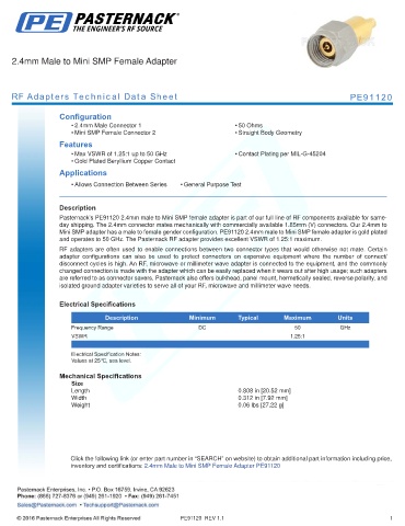 Pasternack’s PE91120 2.4mm male to Mini SMP female adapter is part of our full line of RF components available for same-