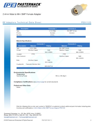 inventory and certifications: 2.4mm Male to Mini SMP Female Adapter PE91120