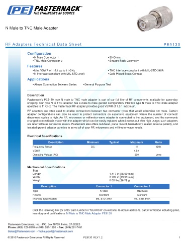 inventory and certifications: N Male to TNC Male Adapter PE9130