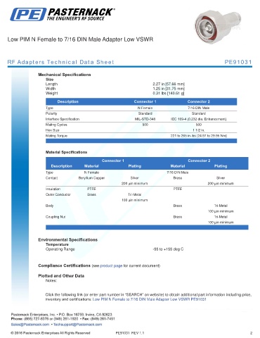 inventory and certifications: Low PIM N Female to 7/16 DIN Male Adapter Low VSWR PE91031