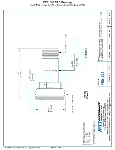 PE91033 CAD Drawing Low PIM N Female to 7/16 DIN Female Adapter Low VSWR PE91033 REV 1.1 4