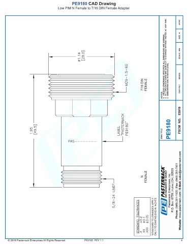 PE9180 CAD Drawing Low PIM N Female to 7/16 DIN Female Adapter PE9180 REV 1.1 4