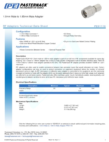 inventory and certifications: 1.0mm Male to 1.85mm Male Adapter PE91118