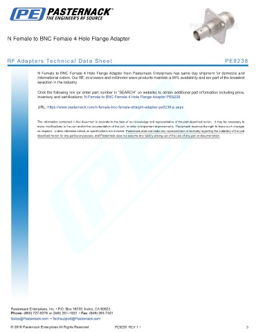 inventory and certifications: N Female to BNC Female 4 Hole Flange Adapter PE9238