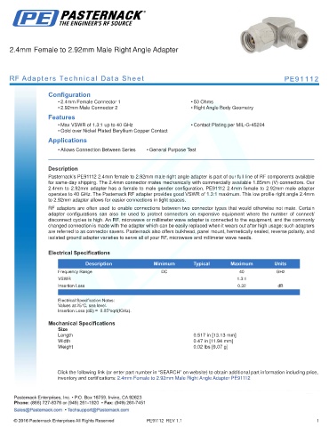 inventory and certifications: 2.4mm Female to 2.92mm Male Right Angle Adapter PE91112