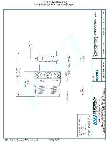 PE9389 CAD Drawing 50 Ohm N Female to 75 Ohm F Male Adapter PE9389 REV 1.1 4