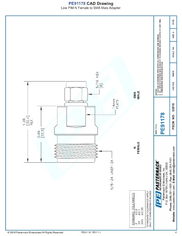PE91178 CAD Drawing Low PIM N Female to SMA Male Adapter PE91178 REV 1.1 4