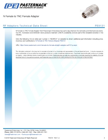 any representation or warranty regarding the suitability of the part described herein for any particular purpose, and Pasternack does not assume any liability arising out of the use of any part or documentation.