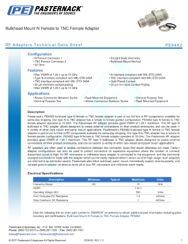 a variety of other rack mount and panel mount applications. Pasternack’s PE9482 bulkhead type N female to TNC female