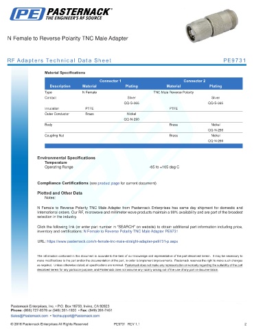 inventory and certifications: N Female to Reverse Polarity TNC Male Adapter PE9731