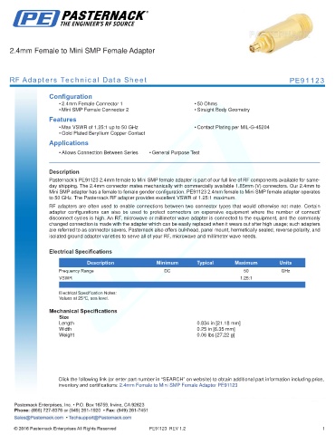 inventory and certifications: 2.4mm Female to Mini SMP Female Adapter PE91123