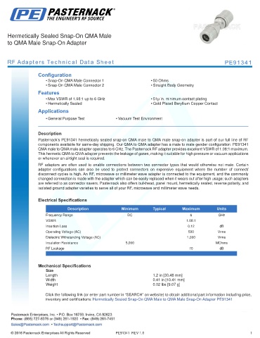 Pasternack’s PE91341 hermetically sealed snap-on QMA male to QMA male snap-on adapter is part of our full line of RF