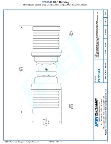 PE91341 CAD Drawing Hermetically Sealed Snap-On QMA Male to QMA Male Snap-On Adapter PE91341 REV 1.0 4