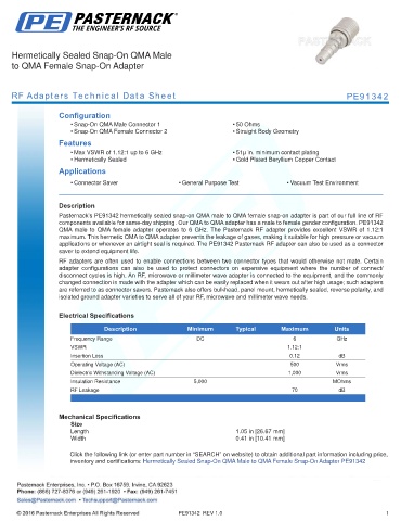 Pasternack’s PE91342 hermetically sealed snap-on QMA male to QMA female snap-on adapter is part of our full line of RF
