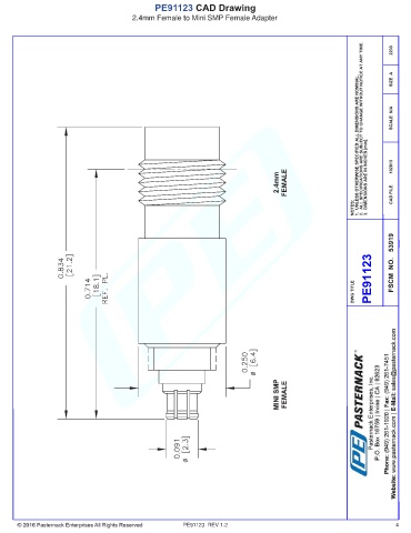 PE91123 CAD Drawing 2.4mm Female to Mini SMP Female Adapter PE91123 REV 1.2 4