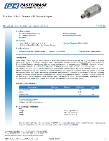 Pasternack’s PE9502 precision 2.4mm female to type N female adapter is part of our full line of RF components available