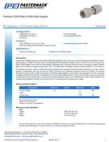 Pasternack’s PE9505 precision SMA male to SMA male adapter is part of our full line of RF components available for same-