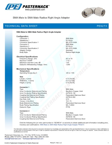inventory and certifications: SMA Male to SMA Male Radius Right Angle Adapter PE9273