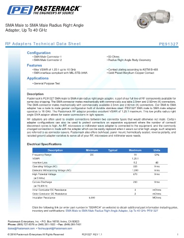 operates to 18 GHz. The Pasternack RF adapter provides excellent VSWR of 1.25:1 maximum. This low profile radius right