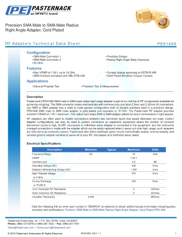 inventory and certifications: Precision SMA Male to SMA Male Radius Right Angle Adapter, Gold Plated PE91458
