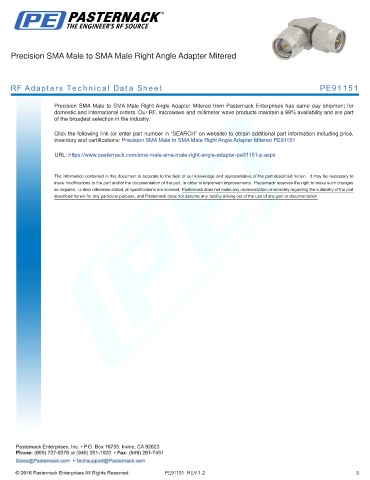 inventory and certifications: Precision SMA Male to SMA Male Right Angle Adapter Mitered PE91151