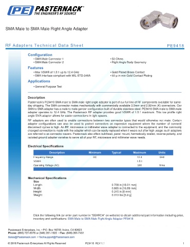 inventory and certifications: SMA Male to SMA Male Right Angle Adapter PE9418