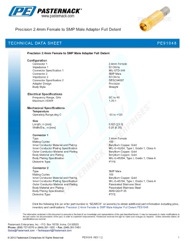 inventory and certifications: Precision 2.4mm Female to SMP Male Adapter Full Detent PE91048