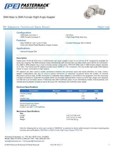to 27 GHz. The Pasternack RF adapter provides good VSWR of 1.35:1 maximum. This low profile right angle SMA adapter
